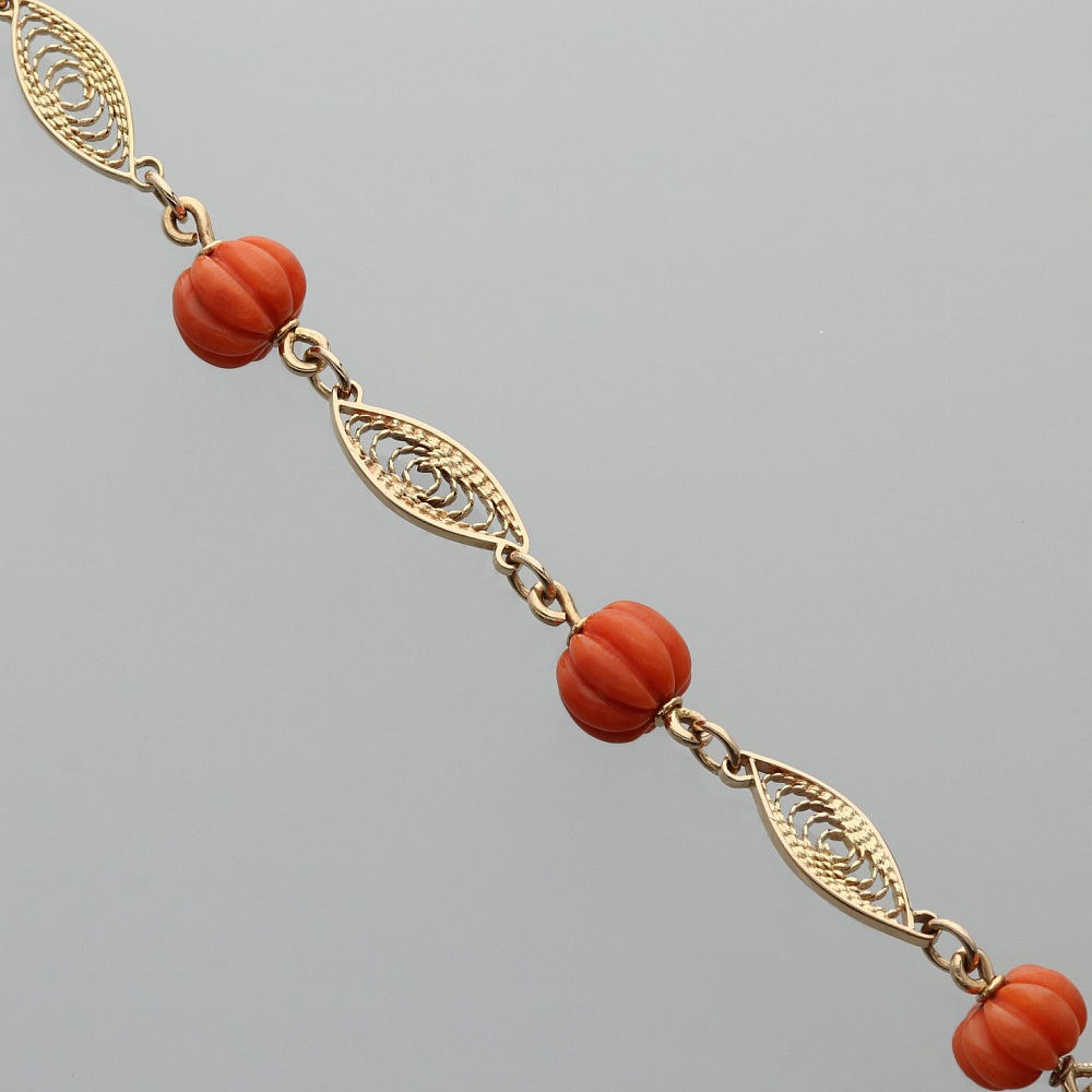 Bransoletka złota z koralem wykonana ręcznie.