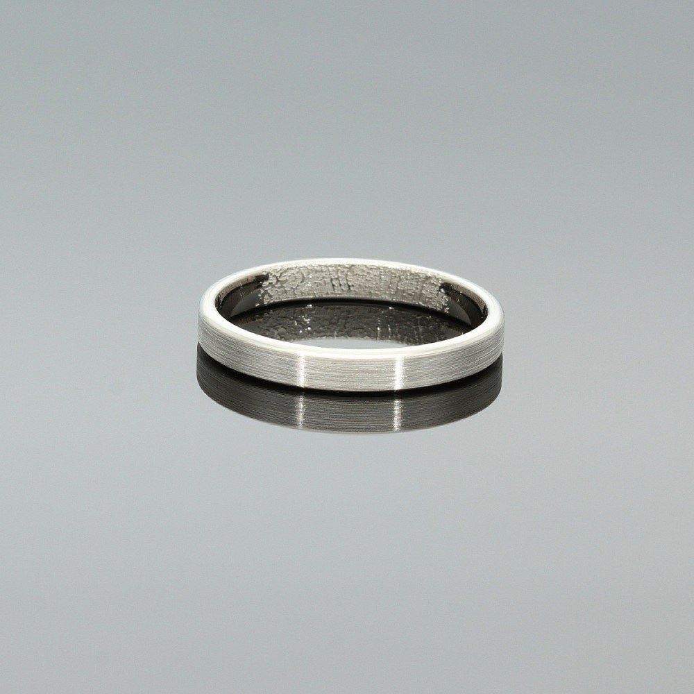 Klasyczna obrączka z białego złota palladowego, w środku której wykonaliśmy grawer "odbicia linii papilarnych".