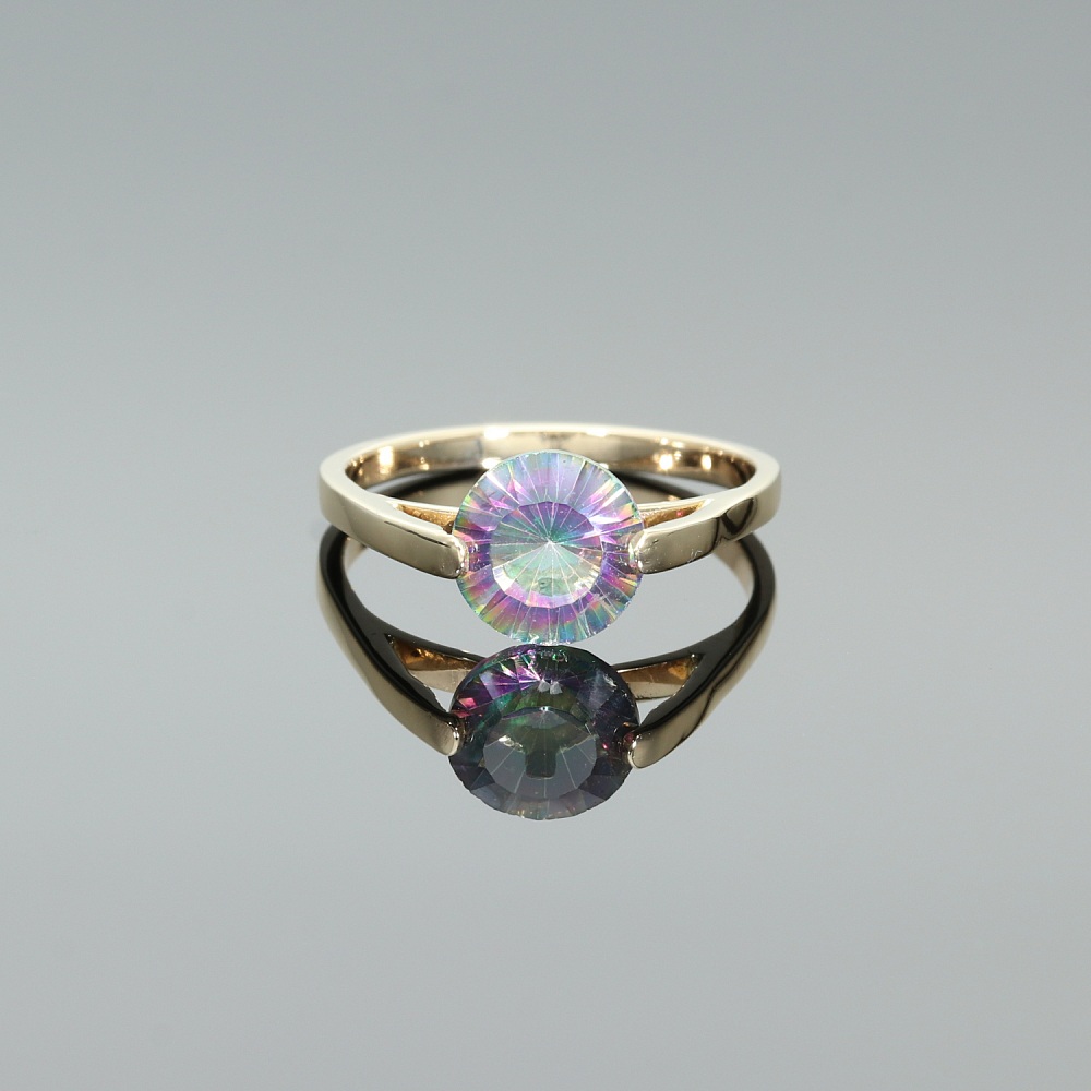 Wykonaliśmy biżuterię od projektu po wyrób końcowy. Zrobiony z żółtego złota próby 585. Kamień oprawiony w 4 łapki, 2 widoczne z góry i 2 pod kamieniem, aby cały topaz było widać z każdej strony.