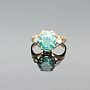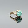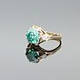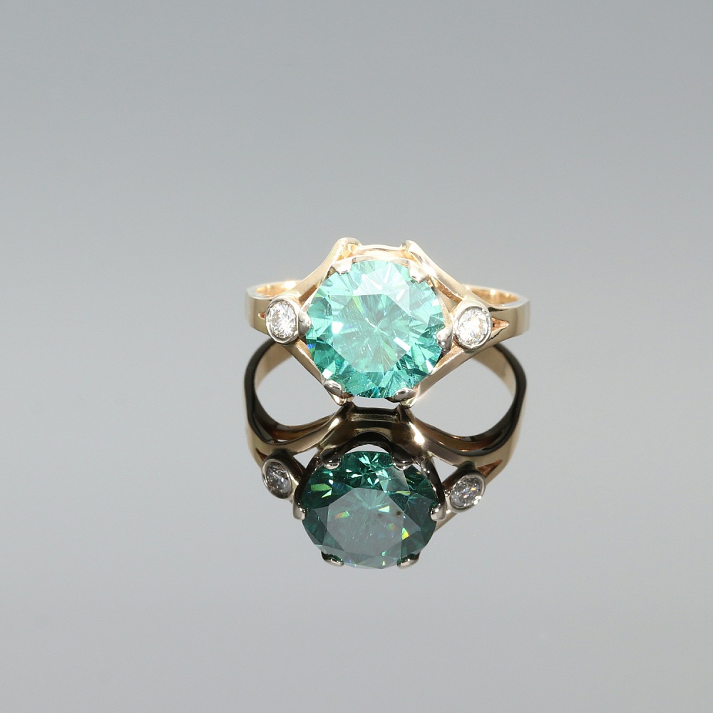 Wykonany z kutego złota, w którym w nietuzinkowy sposób oprawiliśmy dwie cyrkonie i piękny zielony moissanite. Delikatne łapki przytrzymują kamień, który idealnie prezentuje się z każdej strony.