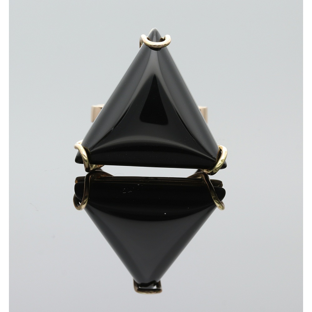 Onyks został nałożony na bazę pierścionka, a łapki delikatnie dopasowane do trójkątnego kamienia.