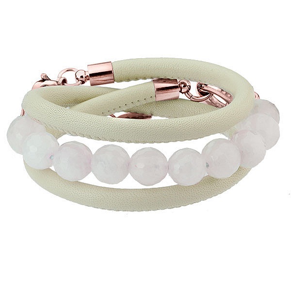 Piękna, damska bransoletka, którą wyróżnia oryginalny i nowoczesny design. Została wykonana z naturalnej skóry oraz białego kwarcu. Model wyposażono w praktyczne zapięcie ze stali szlachetnej, które umożliwia regulację długości. Kolor różowego złota uzyskano dzięki zastosowaniu innowacyjnej technologii PVD.