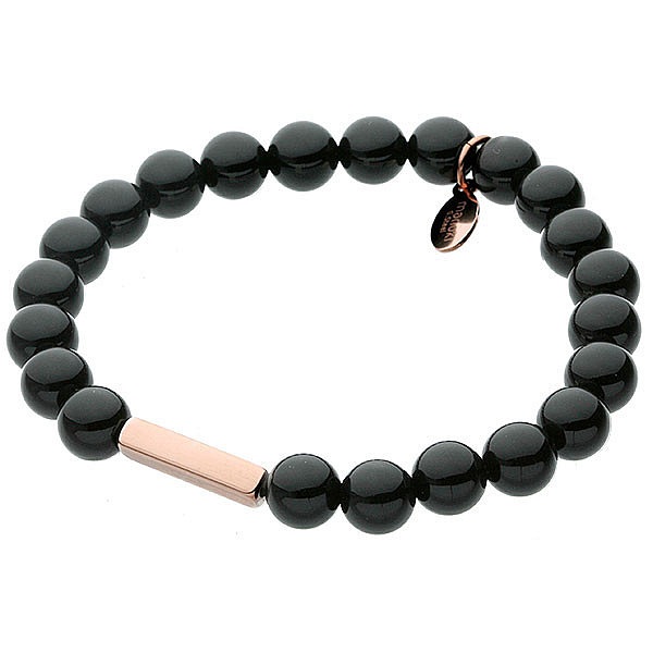 Śliczna bransoletka damska z naturalnych kamieni. Model wykonano z czarnego onyksu. Kamień ten symbolizuje siłę i moc. Biżuterię ozdobiono podłużnym elementem ze stali szlachetnej w kolorze różowego złota oraz zawieszką z logo Manoki.