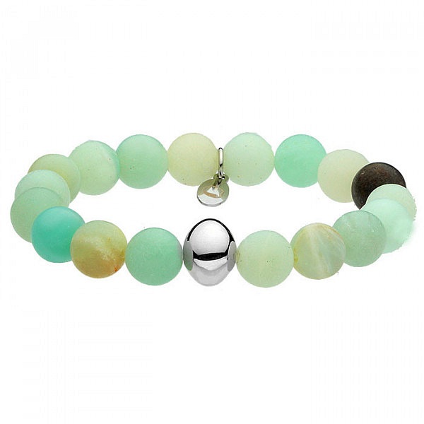 Piękna bransoletka damska, która charakteryzuje się prostym designem, a jednocześnie przyciąga wzrok. Model wykonany jest z naturalnego amazonitu w miętowych odcieniach, kamień ten symbolizuje otwarcie człowieka na otoczenie oraz ma za zadanie chronić przed zmartwieniami i strachem. Bransoletkę ozdobiono minimalistyczną ozdobą ze stali szlachetnej. Każda zamawiana biżuteria z kamieni naturalnych jest jedyna w swoim rodzaju i może nieco różnić się kolorem od prezentowanej na zdjęciach.