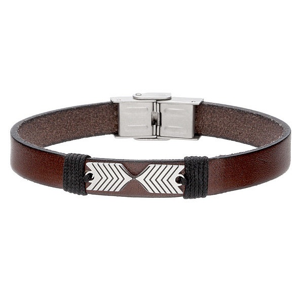 Bransoletka męska w stylu minimalistycznym, zdobiona elementem ze stali szlachetnej w kształcie strzałek. Prosty krój oraz stonowana kolorystyka sprawiają, że pasuje ona do każdej stylizacji. Model wyposażono w praktyczne i wytrzymałe zapięcie z hipoalergicznej stali szlachetnej.