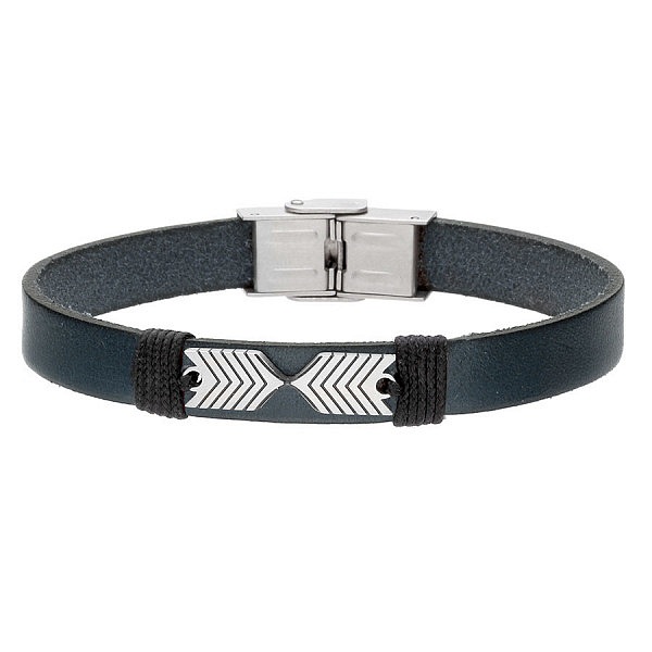 Bransoletka męska w stylu minimalistycznym, zdobiona elementem ze stali szlachetnej w kształcie strzałek. Prosty krój oraz stonowana kolorystyka sprawiają, że pasuje ona do każdej stylizacji. Model wyposażono w praktyczne i wytrzymałe zapięcie z hipoalergicznej stali szlachetnej.