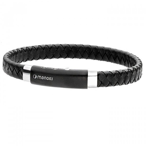 Minimalistyczna bransoletka męska z płaskiego rzemienia naturalnego. Ozdobiona jest elementem ze stali szlachetnej, na którym widnieje logo Manoki. Czarny kolor tego fragmentu uzyskano dzięki zastosowaniu innowacyjnej technologii PVD. Wygodne zapięcie pozwala na regulację długości.