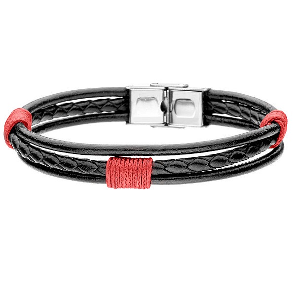 Stylowa bransoletka męska z czarnego rzemienia oraz plecionej skóry. Ozdobiona została czerwonymi elementami ze sznurka. Oryginalne zestawienie kolorów sprawia, że bransoletka wyróżni się na tle każdej stylizacji. Bransoletkę wyposażono w trwałe i wytrzymałe zapięcie z hipoalergicznej stali szlachetnej.