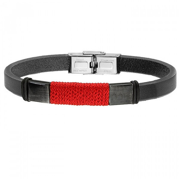 Niezwykła bransoletka dla mężczyzn lubiących oryginalne dodatki. Wykonana została ze skóry naturalnej w kolorze czarnym, czerwonego sznurka oraz stali szlachetnej 316L. Stanowi to kompozycję trwałych materiałów, które doskonale ze sobą współgrają. Stalowe zapięcie jest niezwykle trwałe. Na czarnych elementach jest możliwe wykonanie niewielkiego graweru.