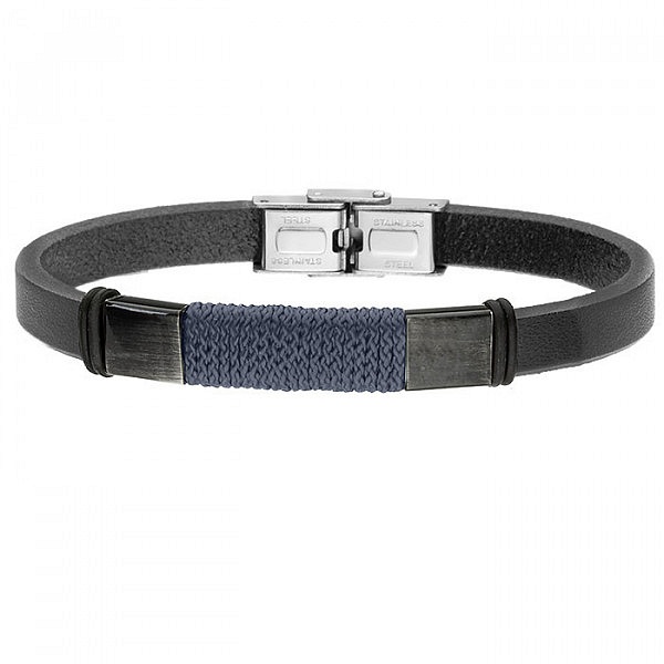 Niezwykła bransoletka dla mężczyzn lubiących oryginalne dodatki. Wykonana została ze skóry naturalnej w kolorze czarnym, granatowego sznurka oraz stali szlachetnej 316L. Stanowi to kompozycję trwałych materiałów, które doskonale ze sobą współgrają. Stalowe zapięcie jest niezwykle trwałe. Na czarnych elementach jest możliwość wykonania niewielkiego graweru.